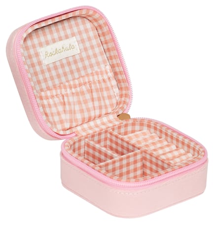 ファスナーを開けると、仕切りスペース、スリップポケット、リングやピアスを差し込める専用スペースがあり、とても使いやすい仕様です。内側はギンガム柄の生地を使用。