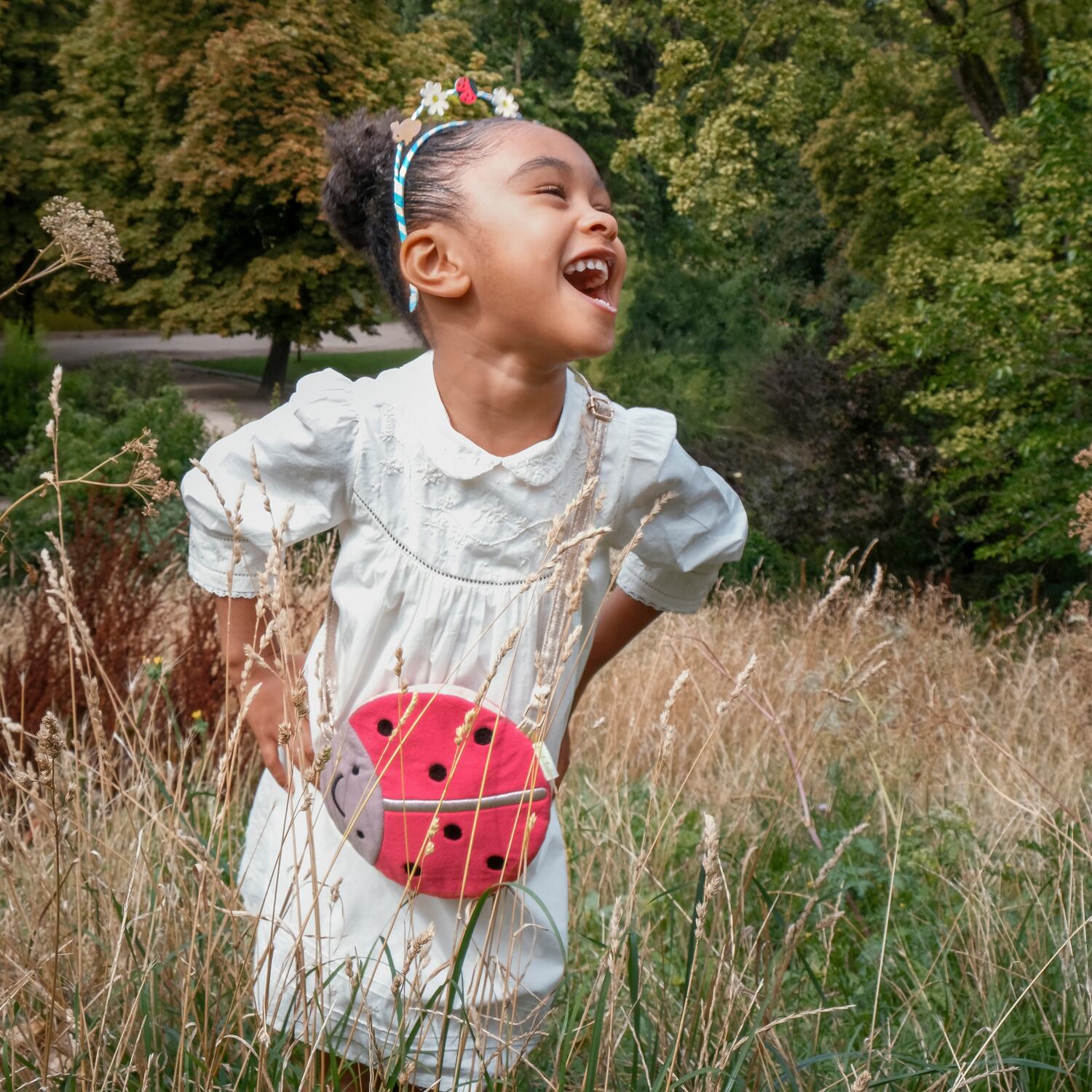 やわらかな素材で仕立てた、カラフルで愛らしいてんとう虫の「リリー」バッグ。 羽には刺繍のドットをあしらい、にっこり笑顔がチャーミングなデザインです。 内側はドット柄のライニング仕様で、マグネットボタンで開閉も簡単。さらに、安全面に配慮したブレイクポイント付きの長さ調節可能なゴールドストラップを採用しています。 夏の午後のお出かけにぴったりな、楽しい相棒です。 サイズ:17.5cm × 15cm × 1cm ストラップ長さ:45cm