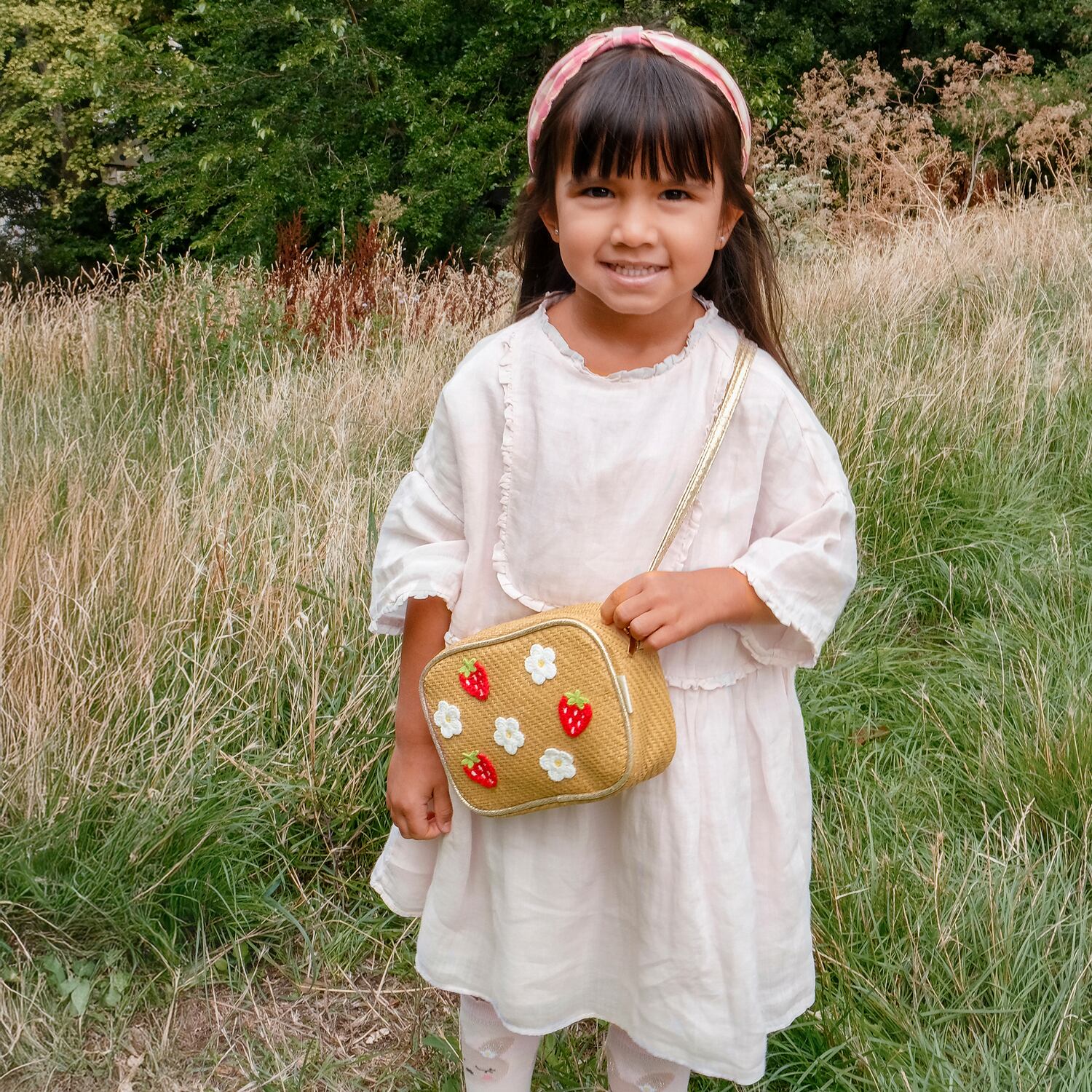 自然が好きなお子さまにぴったりの、ストロベリーフィールズバッグ。 やわらかなラフィア素材に、可愛らしいいちごと小さなデイジーの刺繍をあしらった、ナチュラルで優しいデザインです。 ファスナー開閉で使いやすく、安全面に配慮したブレイクポイント付きの長さ調節可能なゴールドストラップを採用しています。夏のピクニックやお出かけにぴったりのアイテムです。 サイズ:18cm × 13cm × 5cm ストラップ長さ:46cm